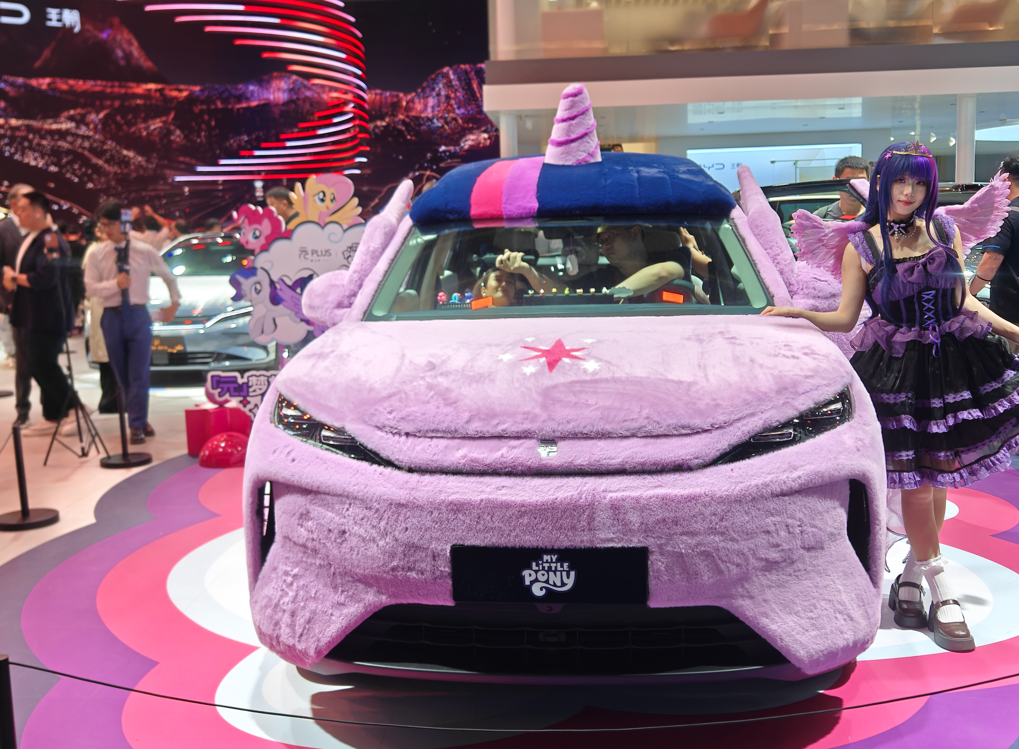 比亚迪不只展馆面积巨大,新车规划也不小,王朝、海洋、仰视、腾势、方程豹五大品牌,均有新车初度露脸,还与小马宝莉联合推出了定制款车型。比亚迪乃至在展馆内打造了一个大型“冰箱”,用于展示闪充技能在零下30℃环境的充电作用。